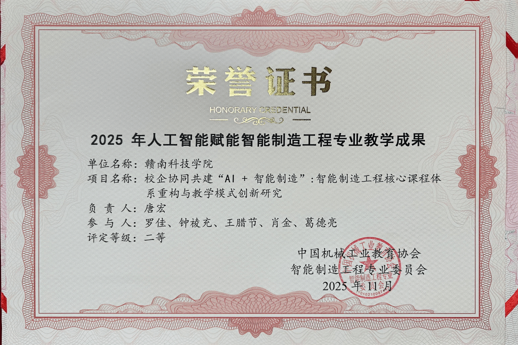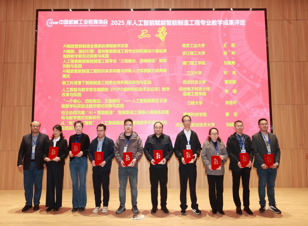 本网讯:11月21日至23日,2025 年中国机械工业教育协会智能制造工程专业委员会智能制造人才培养主题研讨会在福耀科技大学顺利落下帷幕。在人工智能赋能智能制造工程专业教学成果评定中,智能制造与材料工程学院凭借在智能制造人才培养领域的扎实探索与创新实践,斩获二等奖殊荣,充分彰显了学院在该专业教学改革中的显著成效与行业认可度。