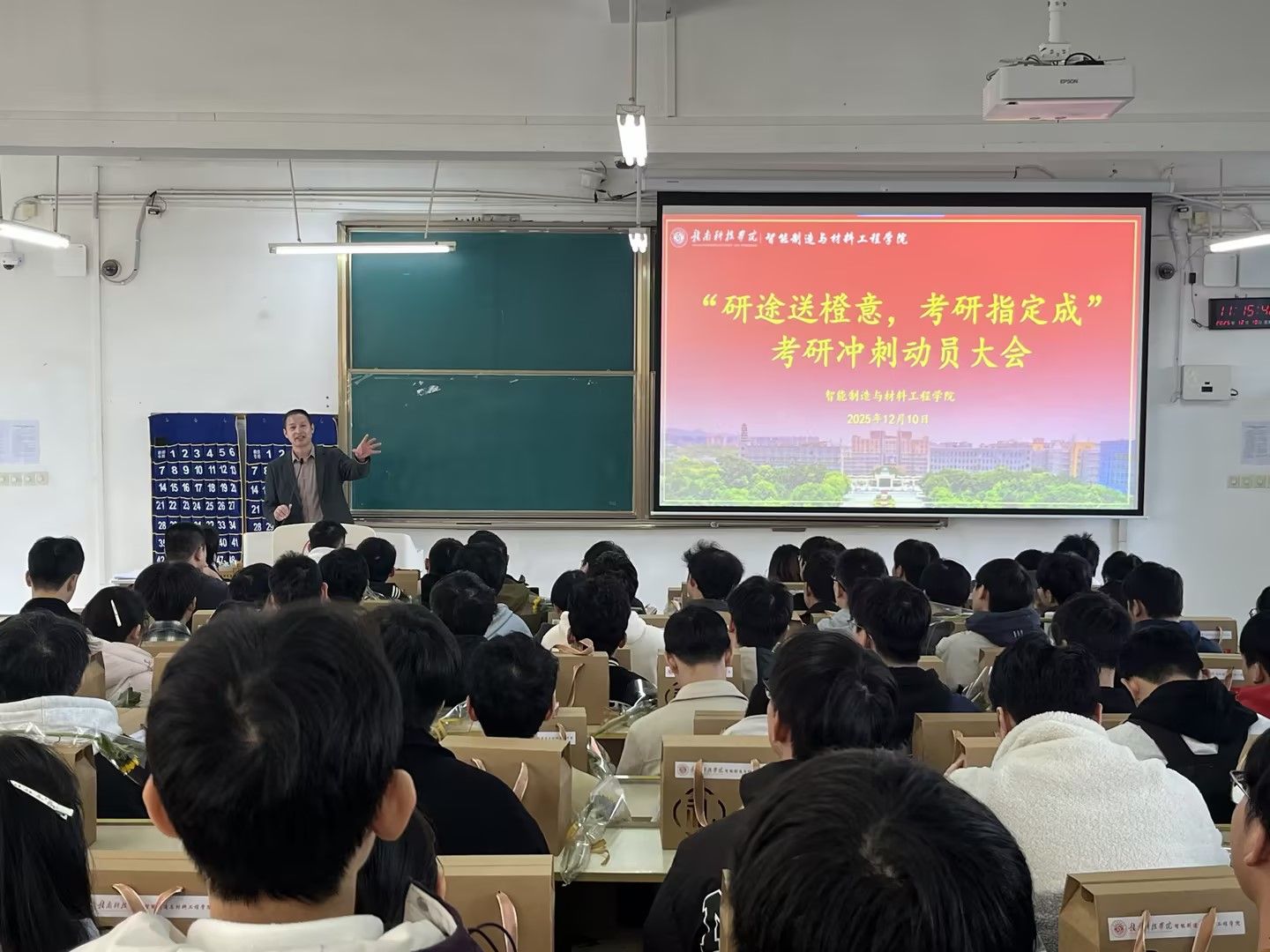 本报讯:考研在即,为有效缓解学子备考压力、增强学子信心,12月10日中午11点,智能制造与材料工程学院于主教Z2D1教室举办“研途送橙意,考研指定橙”考研冲刺动员大会,以实际行动彰显育人担当,为2025届考研学子送上暖心助力。
