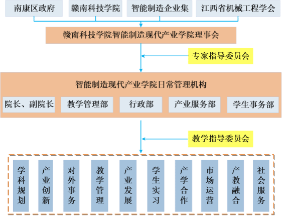 产业学院由赣州市南康区人民政府、赣南科技学院、格力电器(赣州)有限公司、江西志浩电子科技有限公司、孚能科技(赣州)股份有限公司、江西江铃集团新能源汽车有限公司、江联重工集团股份有限公司与江西省机械工程学会等多方共建,实行理事会领导下的院长负责制。